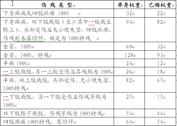 单身的(丧偶、离异)50%--100%伤残的受害者只要没有改变家庭状况就可得到上表所列权重的双倍护理费。