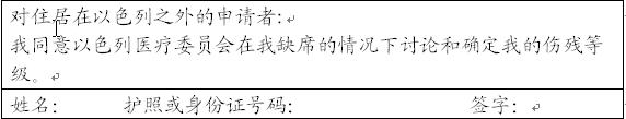2,如果不生活在以色列,医疗委员会将根据你所递交的医疗证明在你缺席的情况下确定你的伤残等级。委员会的最终结论将一书面形式通知你。